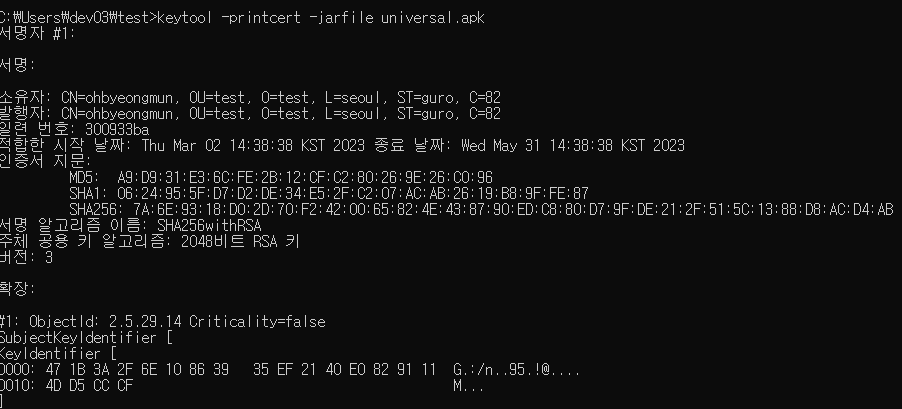이제 생성한 키스토어로 아까 추출한 .apk 파일 서명을 진행 하겠습니다.