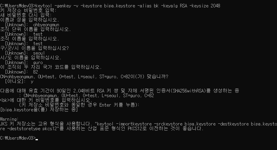 keytool -genkey -v -keystore <임의파일명.keystore> -alias <임의별칭> -keyalg RSA -keysize 2048