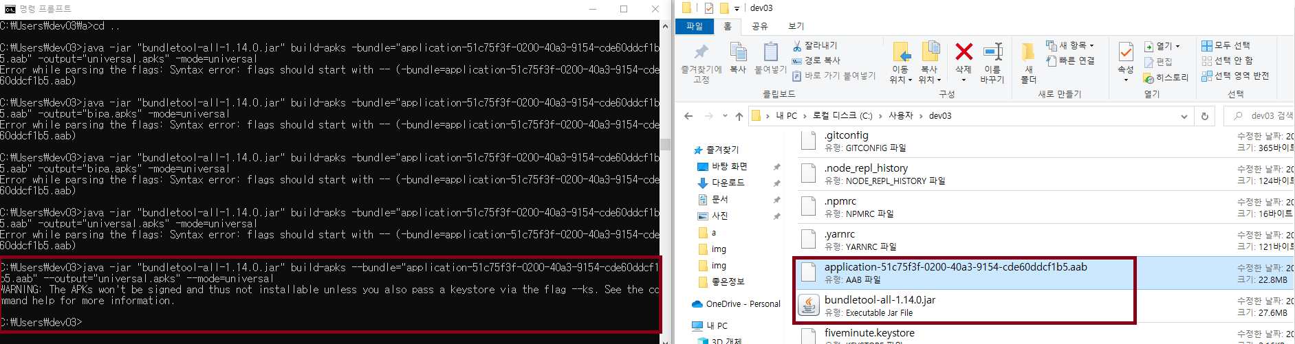java -jar "bundletool-all-1.8.0.jar" build-apks —bundle="AAB파일이름.aab" —output="universal.apks" —mode=universal