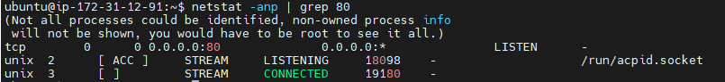 예를들어 80번 포트를 쓰고 있는 프로세스가 누구인지 알아보려면 다음과 같이 명령을 실행하면 된다.