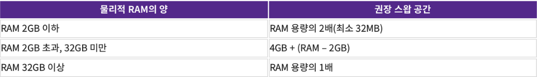 AWS가 제공하는 권장 스왑 공간은 다음과 같다.