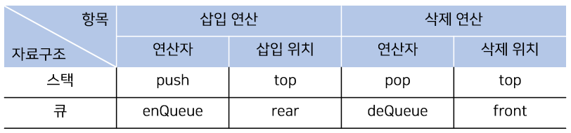 스택과 큐에서의 삽입과 삭제 연산을 표로 비교하면 다음과 같습니다.