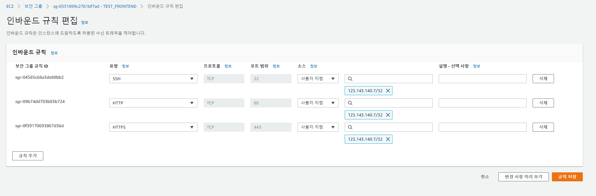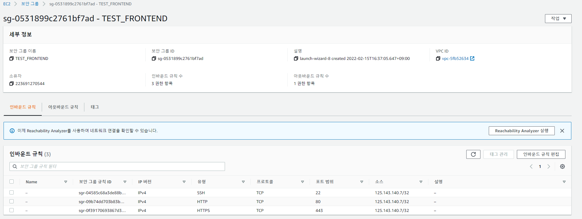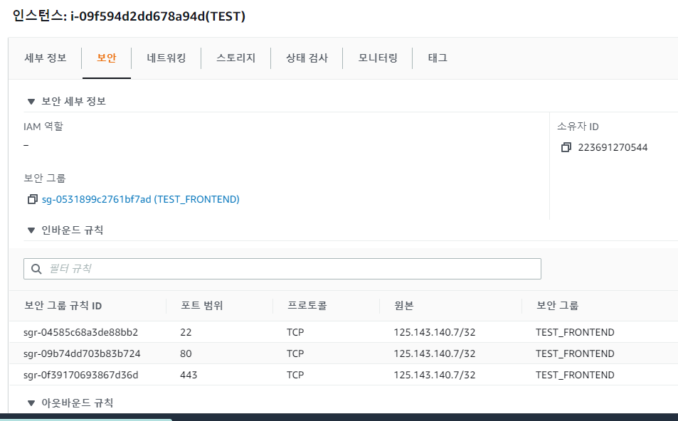 보안 그룹 으 로 들어가면 설정 해 놓은 보안 사항을 볼 수 있다