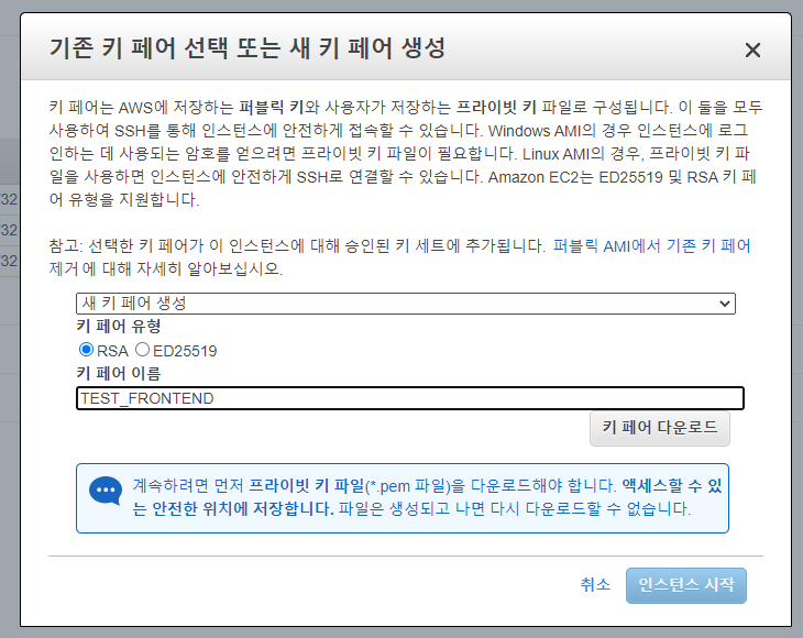 10. 키페어 생성 ( 키페어 다운로드 받은 후 프로젝트 별 폴더에 따로 보관하는것이 좋음 )