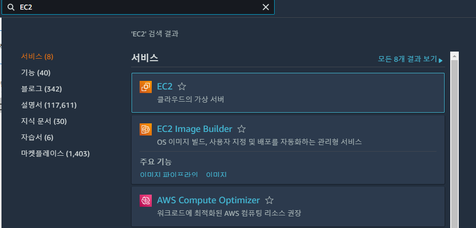 1. 아마존 로그인 후 상단 검색창에 EC2 입력 후 대시보드 이동 가상 머신 시작