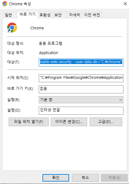 기존에는 --disable-web-security 만 붙히면 됐는데 지금은 --user-data-dir 인자를 추가로 더 붙혀야 한다.